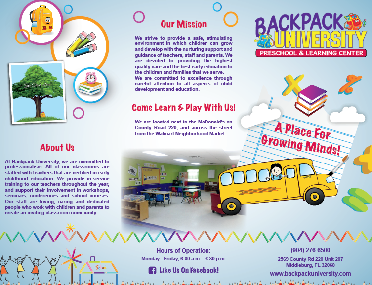 When Backpack University moved to a new building, its owner decided the daycare center’s website and brochure needed some serious updates. I collaborated with a graphic designer and web editor to completely refresh the daycare’s site and informational brochure with a fun look and more creative, engaging content.